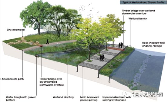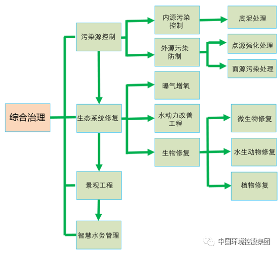中国环境控股集团在水环境综合治理多个项目实践基础上,为水资源开发、水源保护、城市河流周边地区绿地、道路、岸坡等不同源头的降雨径流的控制、水景观提升、水质净化梳理出一个成熟的技术思路,如下图: