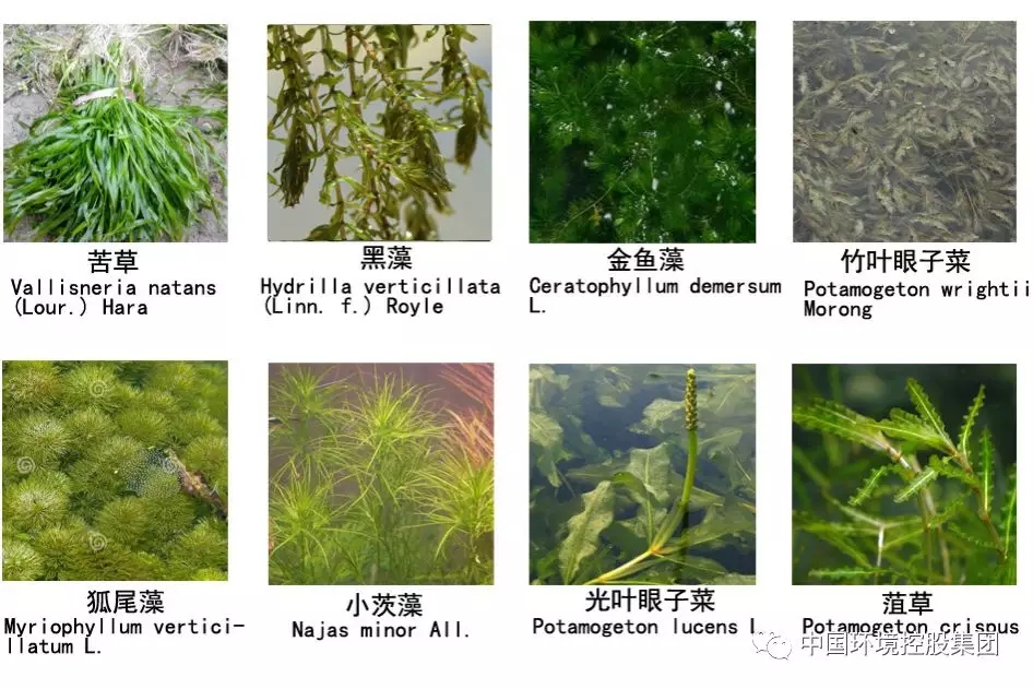 沉水植物:沉水型水生植物根基生于泥中,整个植株沉入水中,具发达的通气组织,利于进行气体交换,如:竹叶眼子菜、狐尾藻、黑藻、苦草、金鱼藻、菹草等
