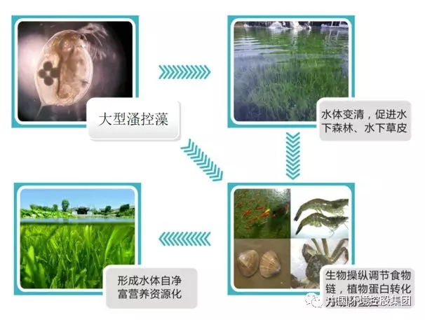 采用大型溞控藻-沉水植物引导水体生态系统是一种综合生物治理技术,其基本思路是:首先以大型溞摄食藻类,提高透明度,控藻滤食有机悬浮物颗粒等作为启动因子,为水下植被生态修复创造条件;在配置沉水植物为主的水生植物吸收氮磷等营养物质,降低富营养化程度,逐步引入浮游动物、鱼虾类、螺贝类和有益微生物群,继而引起各项生态系统恢复的连锁反应:包括从底泥有益微生物恢复、底泥昆虫蠕虫恢复、底栖螺贝类恢复到沉水植物恢复、土著鱼虾类等水生生态系统恢复,构建“大型溞—水生植物—水生动物—水下森林-微生物群落”清水型生态系统,最终实现水体的内源污染生态自净功能和系统经济服务功能。