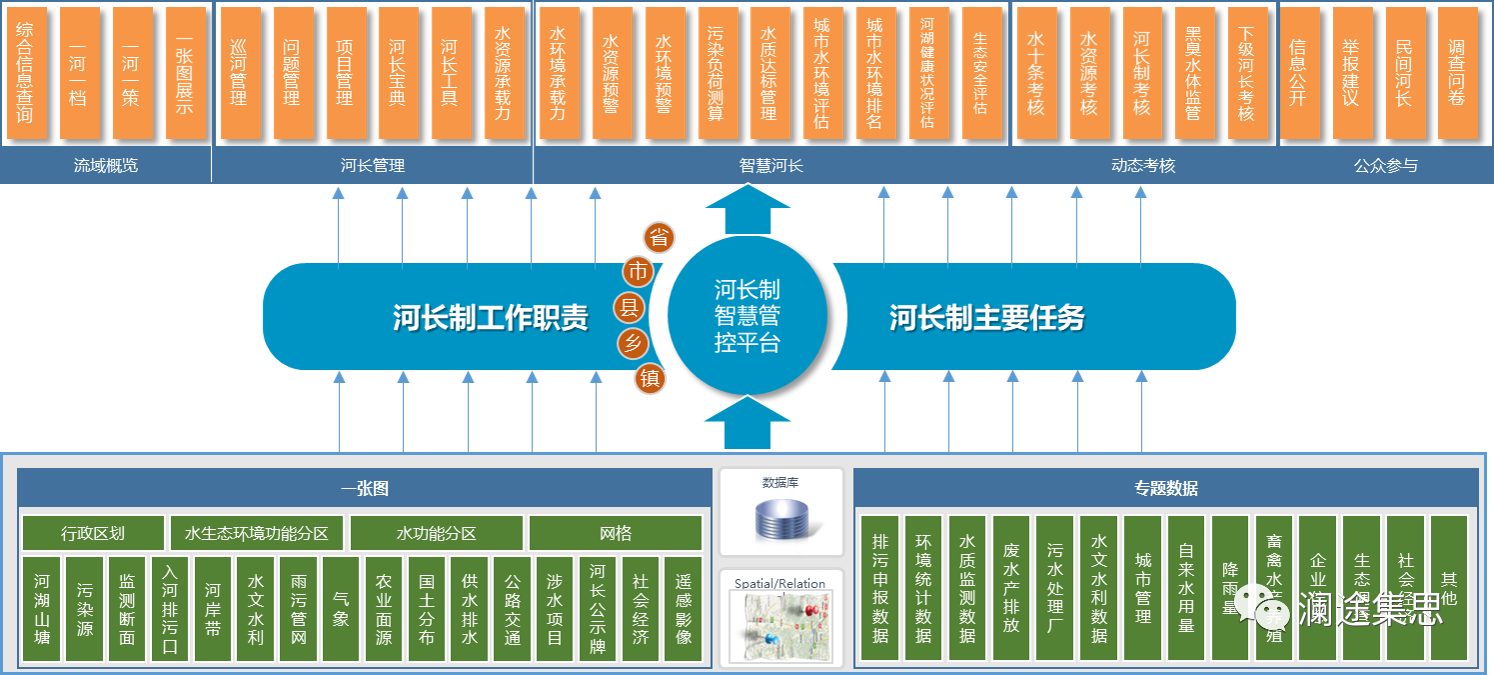 澜途集思“河长制综合管理平台”以“一张图”挂图作战系统为目标,以河湖涉水事件为主线,以日常巡查和公众监督为抓手,整合全部基础数据、监测数据、监控视频、遥感解译数据,建立“一河一档”、“一河一策”。平台是一个基于河道管网信息,面向各类用户构建“移动巡查、公众监督、云端监管”的一体化、智慧化河长制信息化平台,实现对河湖库渠的精准管理、动态监控和高效维护。
